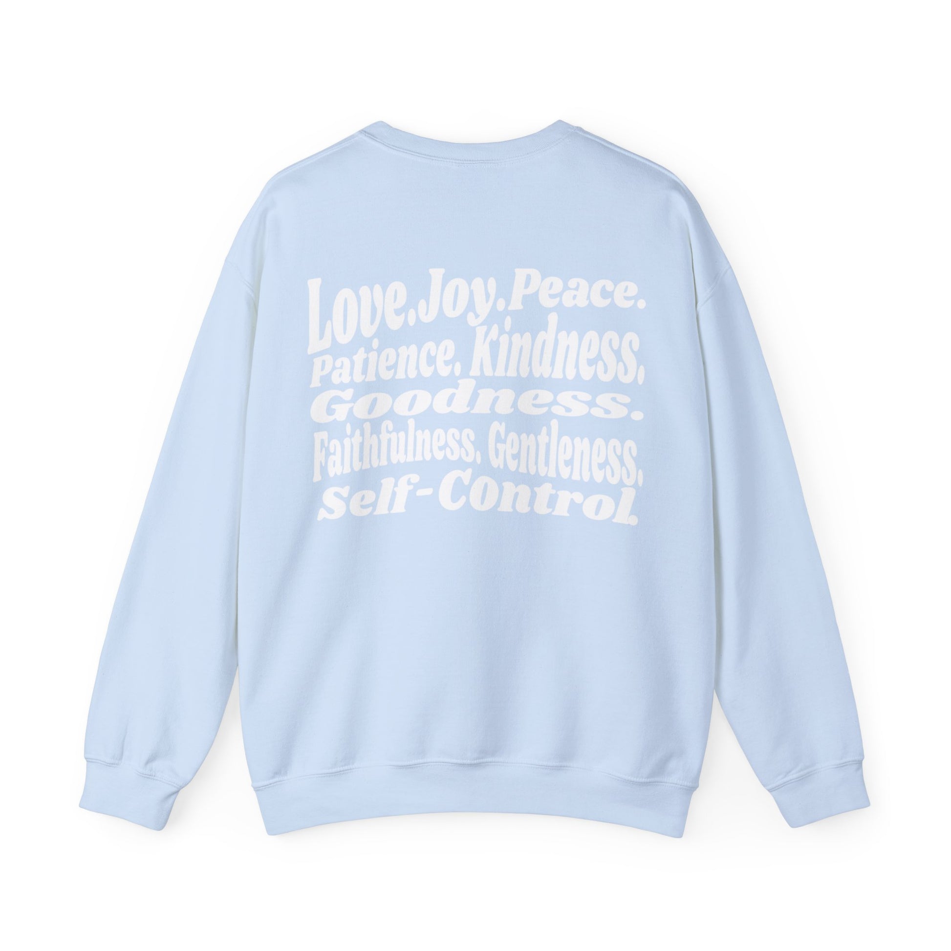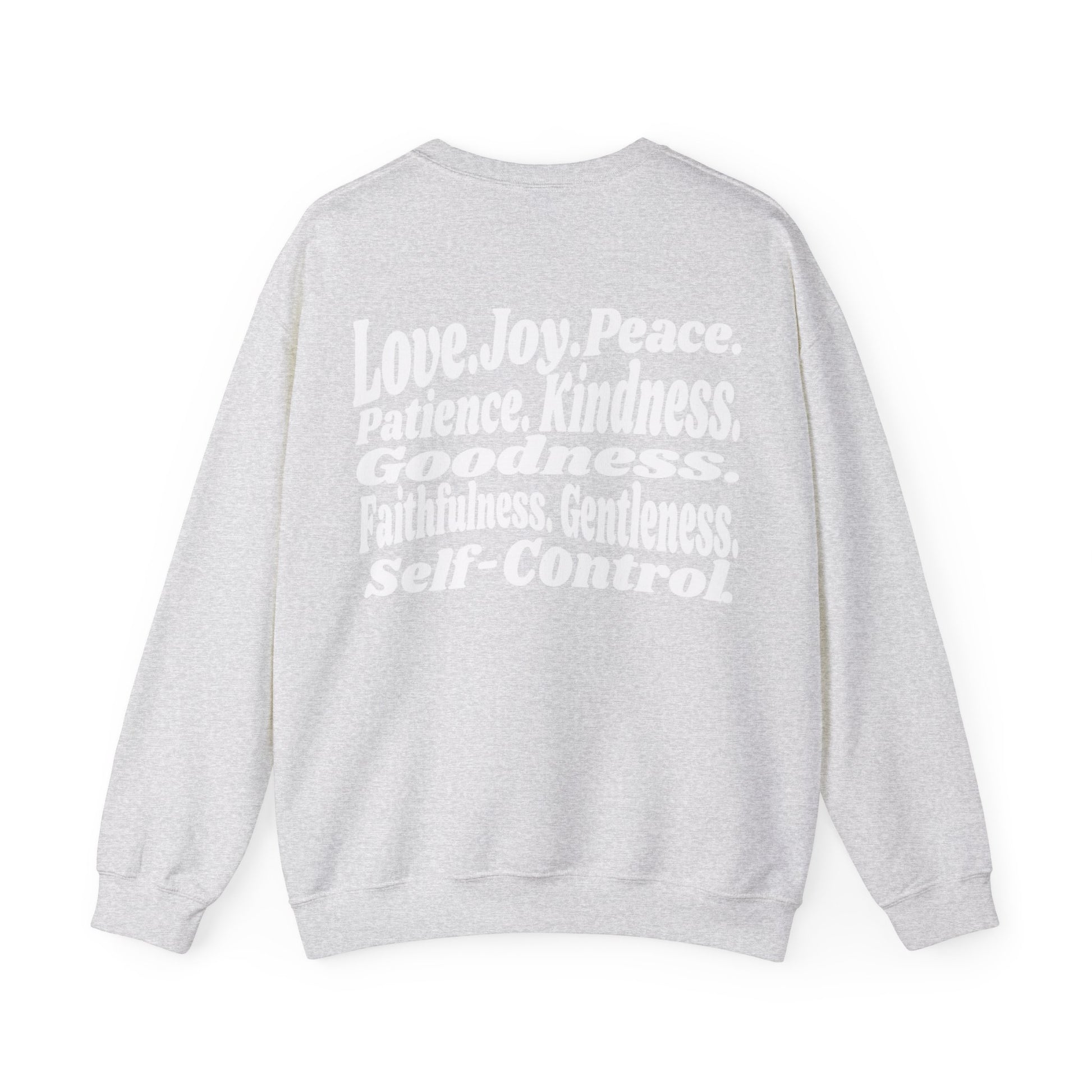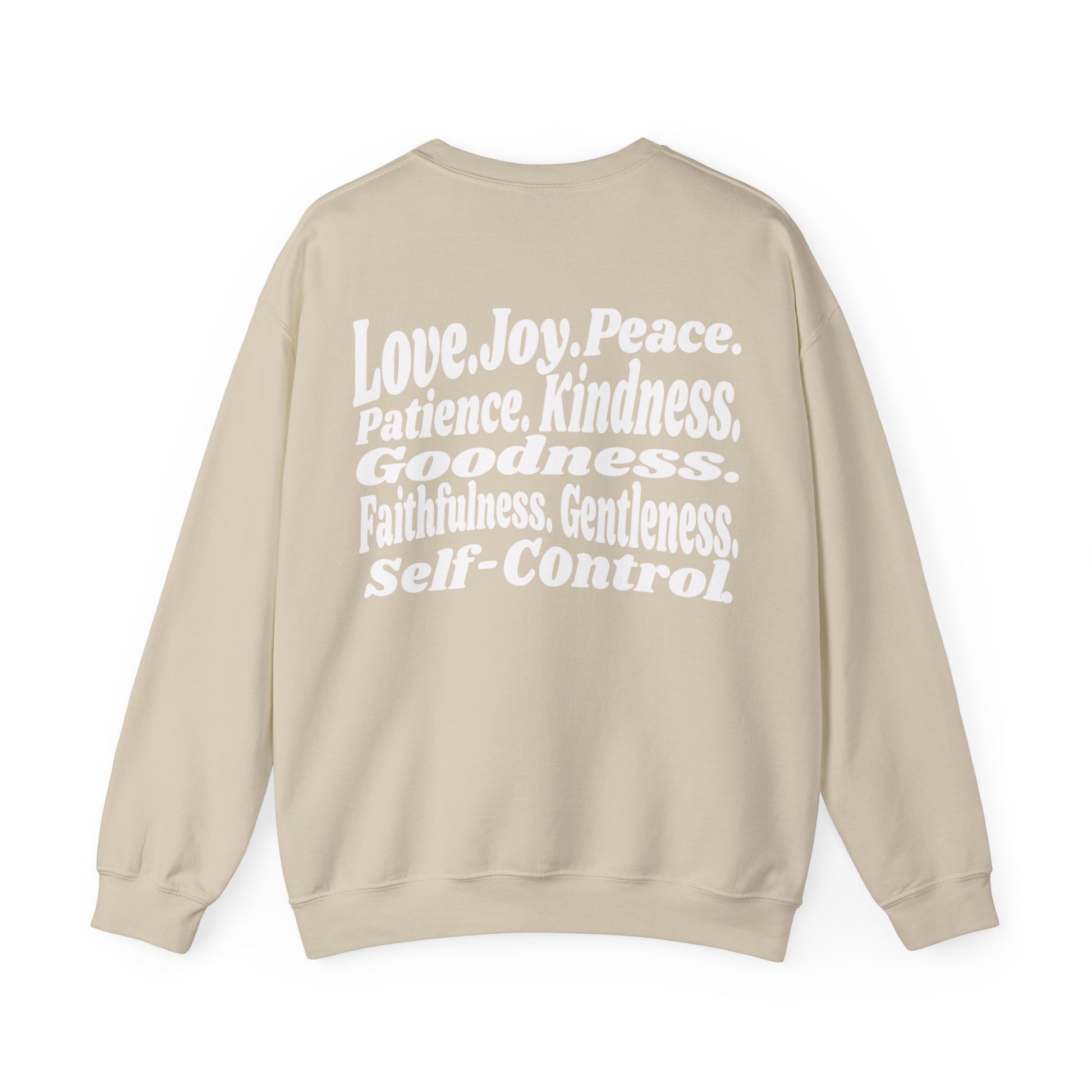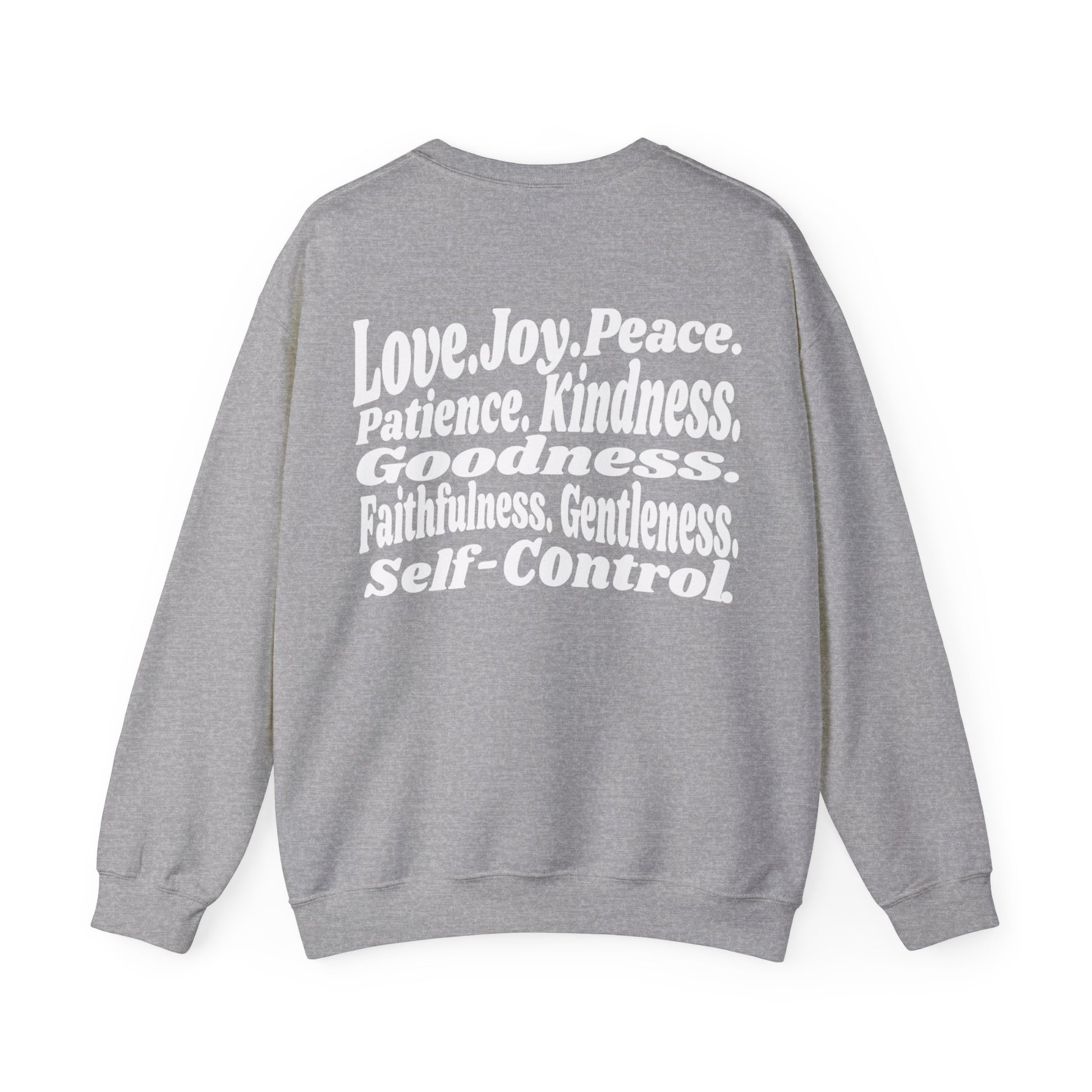 The "fruit of the spirit" crewneck faith apparel. Ideal for any situation, this unisex heavy blend crewneck sweatshirt offers pure comfort and coziness. Perfect for colder months, it features a medium-heavy fabric blend of 50% cotton and 50% polyester. The classic fit and crew neckline provide a comfy wearing experience with top-tier durability. Say goodbye to itchiness with the gray tear-away label. Relevant to those seeking Christian-inspired apparel for everyday wear or as a gift for religious holidays and celebrations.